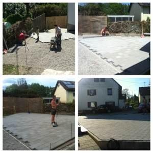 Hier seht Ihr die Vorarbeiten an denen natürlich auch der Supergötti wieder beteiligt war. Erstmal musste gebuddelt werden um eine gute Grundfläche zu erhalten. Danach wurde Schotter aufgefüllt, abgerüttelt und der Splitt wurde verteilt.